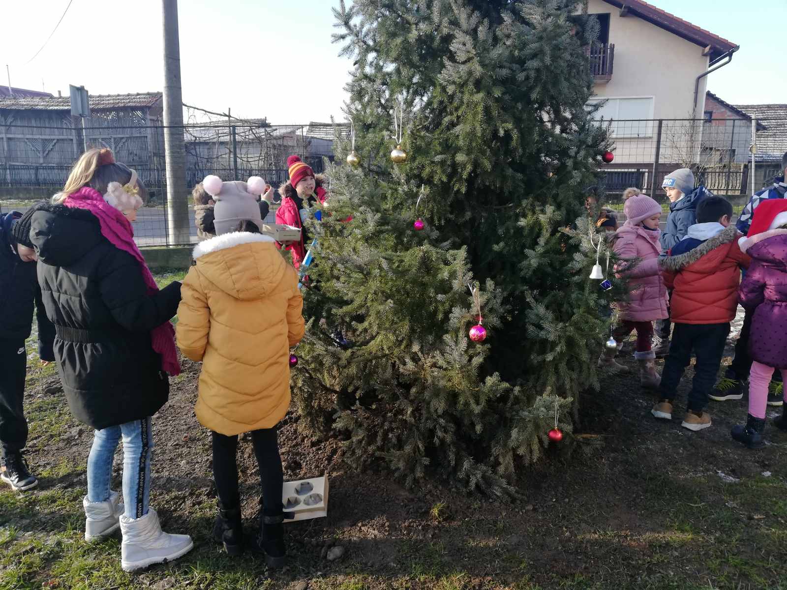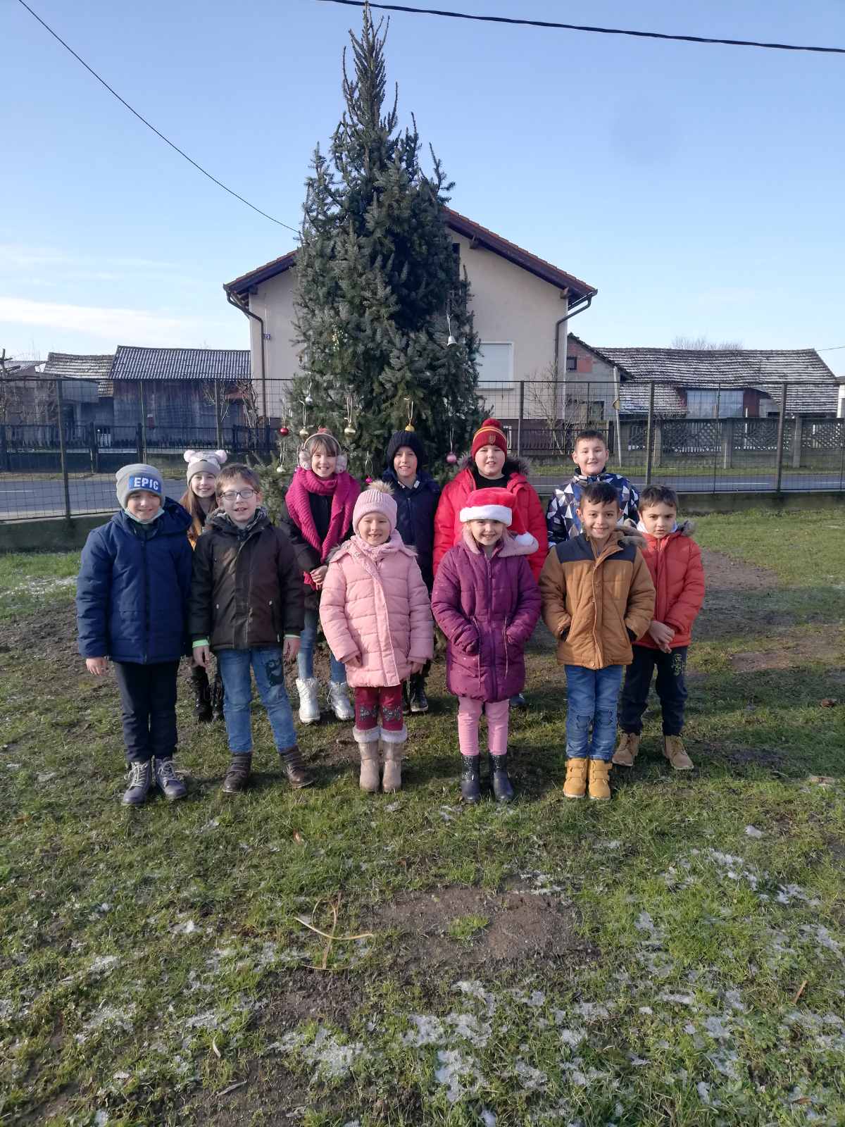 Članice udruge osigurale su božićne ukrase za ukrašavanje bora, a mali đaci su s oduševljenjem prionuli poslu.